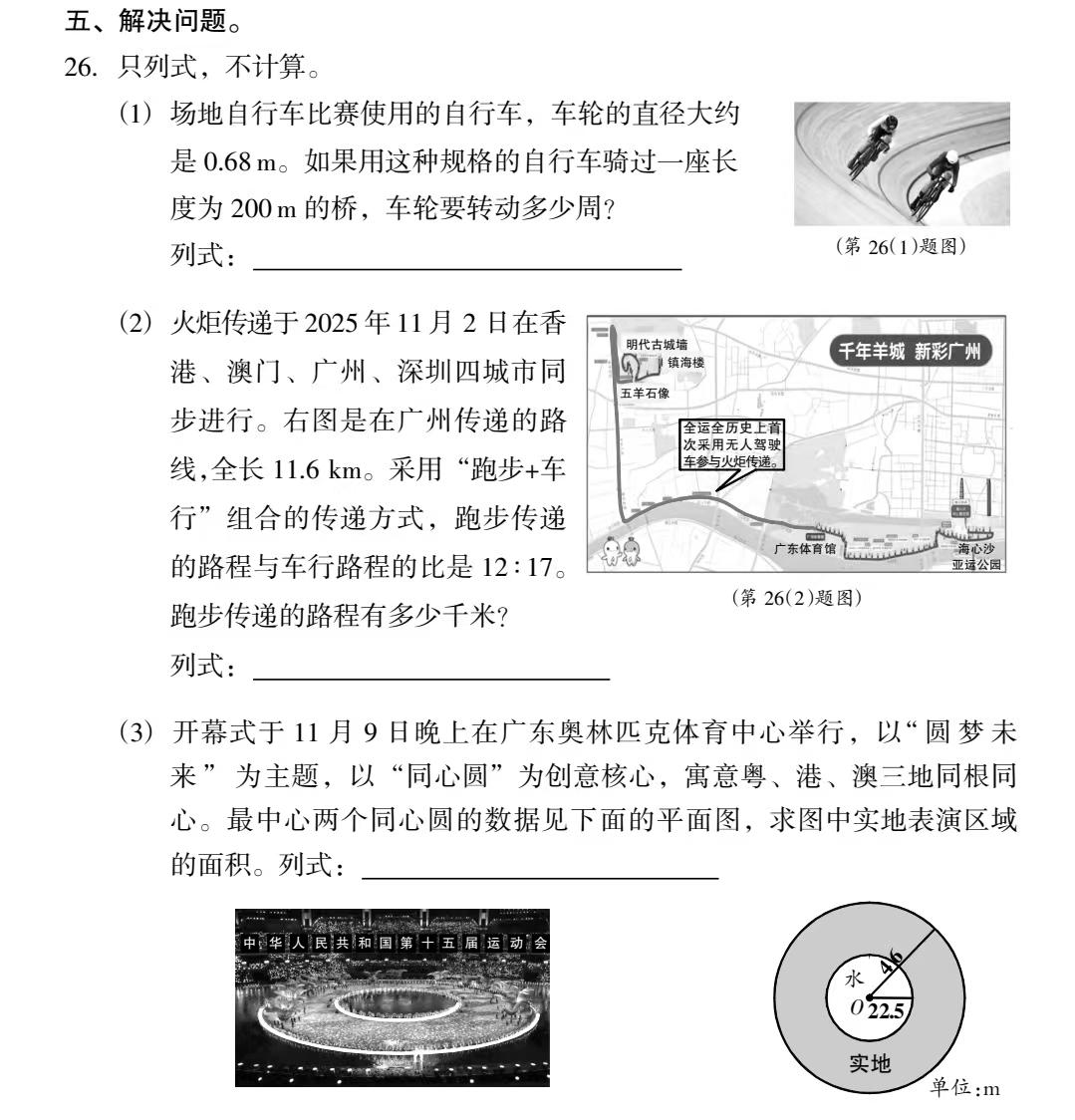 如某区的六年级语文围绕粤剧艺术、鲁迅童年、水银体温计禁产等社会文化或科学议题设计阅读与表达任务,引导学生关注现实、思考社会。而数学则将全运会贯穿始终,如参赛选手年龄分布(扇形图)、场馆装饰颜料配比、自行车车轮转动计算等,将数学知识嵌入体育赛事这一真实情境。